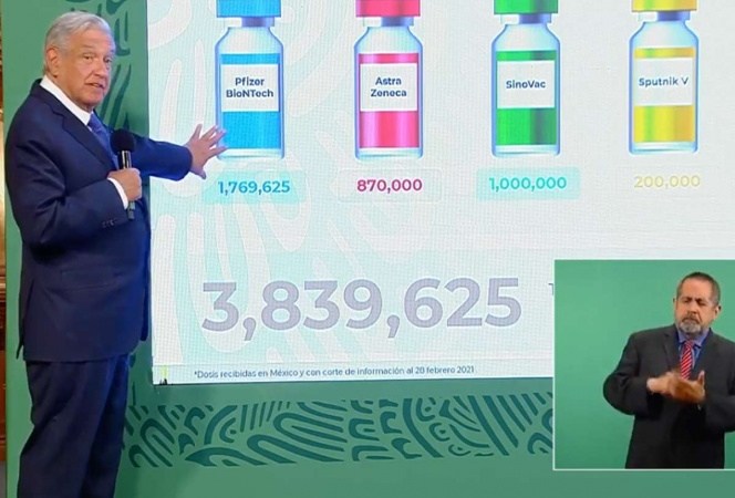 El jefe del Ejecutivo mostró una gráfica en la se señaló que de Pfizer se han recibido 1,769,625 dosis contra el coronavirus.