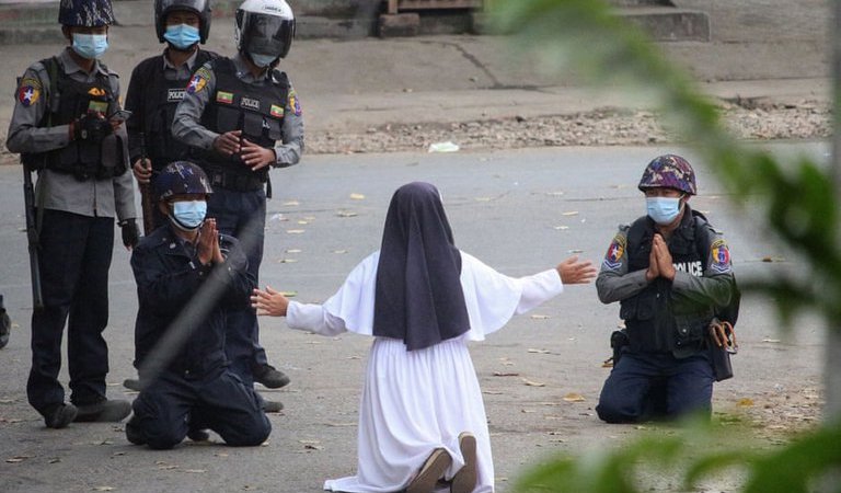 La imagen de la monja católica con un simple hábito blanco, con las manos extendidas, suplicando a las fuerzas de la nueva junta del país mientras se preparaban para reprimir una protesta se ha vuelto viral y le ha valido elogios en el país de mayoría budista.