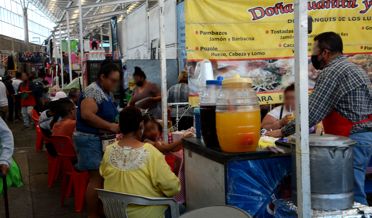 Por lo que, en los pasillos de venta de comida, nos pudimos percatar que en su mayoría los comensales permanecían sentados en las mesas con sus alimentos, mientras otros permanecían de pie cerca de las parrillas.