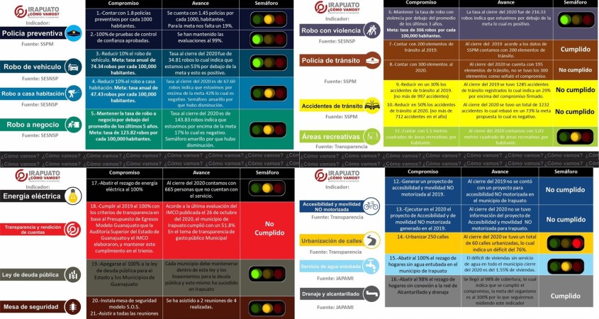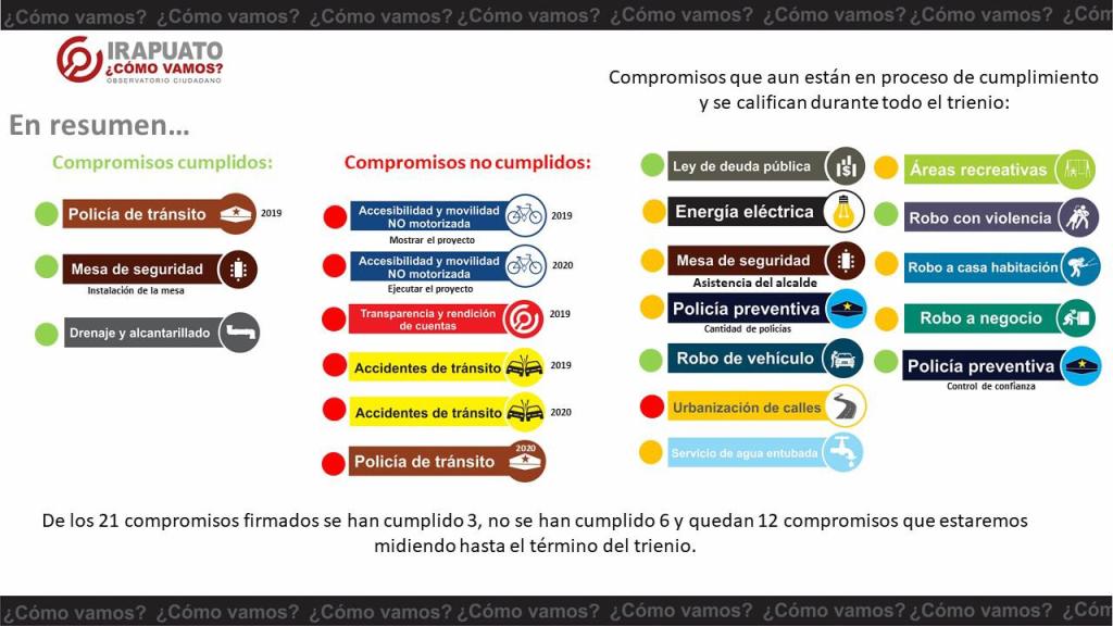 El observatorio ciudadano Irapuato ¿cómo vamos? da cuenta de los compromisos firmados por el alcalde al cierre del año 2020.