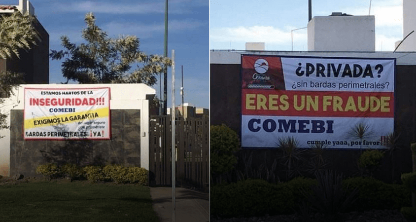 “¿Privada? ¿Sin barda perimetral? Eres un fraude Comebi”, “Estamos hartos de la inseguridad Comebi”, “Exigimos la garantía de un lugar seguro dónde vivir”, “No confíes en Comebi, no cumple”, fueron parte de las consignas colocadas en el residencial.