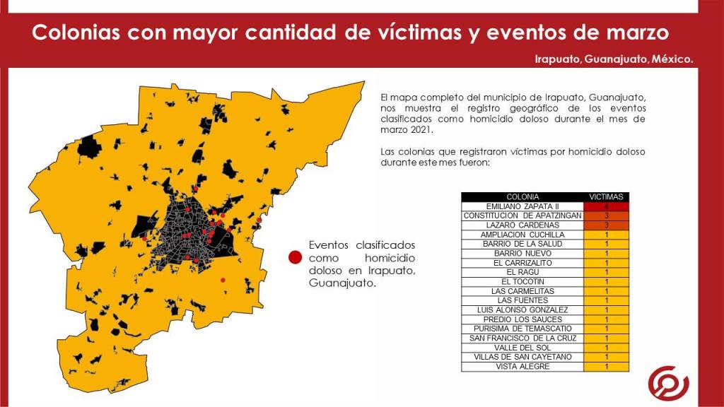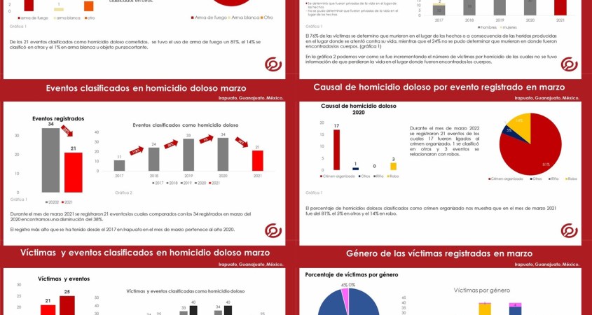 El reporte mensual de víctimas por homicidio doloso presenta la información condensada del registro de víctimas y eventos acontecidos en el municipio de Irapuato, Guanajuato. Los datos que destacaron en el reporte de marzo 2021: