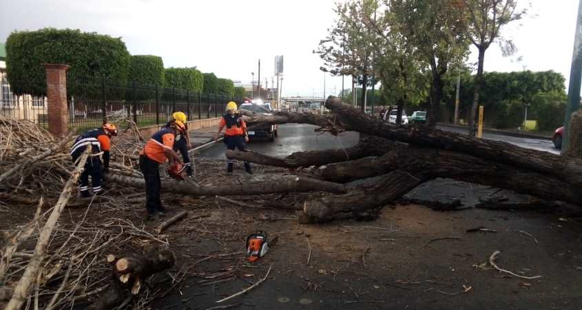 En la parte externa del plantel CONALEP, en la colonia Las Carmelitas, se retiró la rama de un árbol que cayó en el lugar y, otro árbol que cayó sobre la avenida Las Arboledas, a la altura de una plaza comercial, también fue retirado.