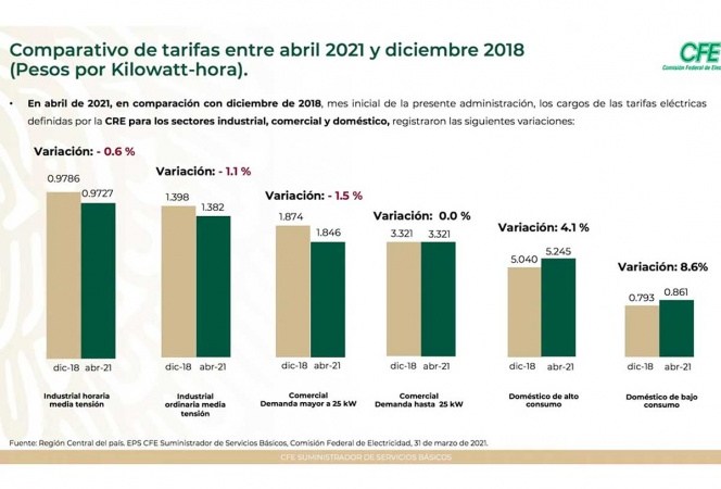 Detalló que de acuerdo con los cargos de las tarifas eléctricas definidas por la CRE para los sectores industrial, comercial y doméstica se registraron distintas variaciones desde diciembre de 2018 y abril de 2021.