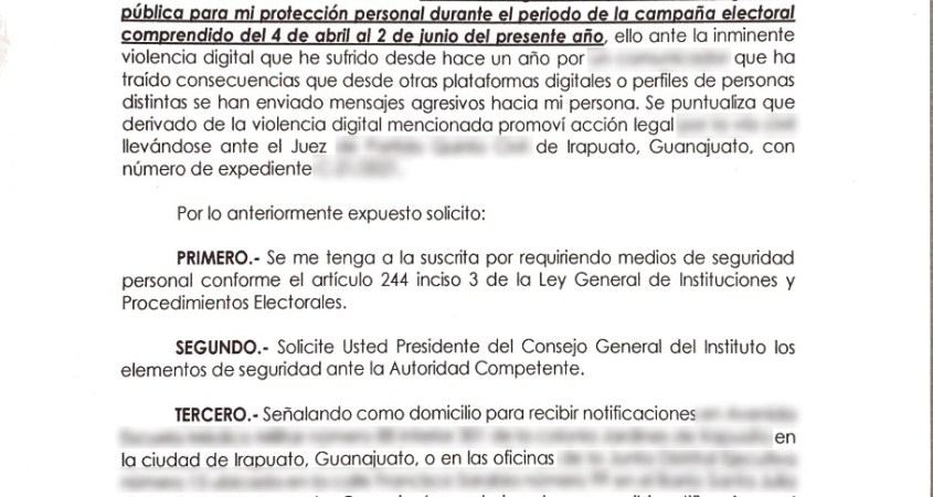 La solicitud se realizó de forma preventiva y derivada de violencia y amenazas en vía digital de la que ha sido objeto en precampaña, intercampaña y ahora en campaña.