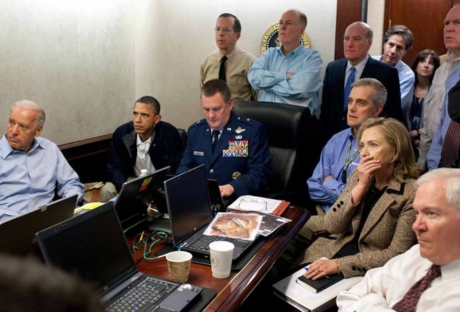 Una famosa fotografía de la Casa Blanca muestra a Obama, Biden, Brennan y los demás funcionarios amontonados hombro con hombro alrededor de Webb, mirando nerviosamente el vídeo en silencio mientras se desarrollaba la redada.