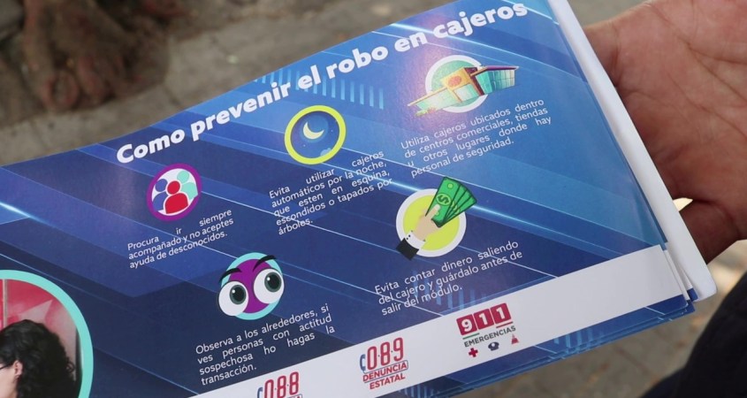 Al exterior de las sucursales bancarias, las y los ciudadanos reciben información para poder detectar y prevenir situaciones de riesgo, al ingresar a un banco y al retirarse.