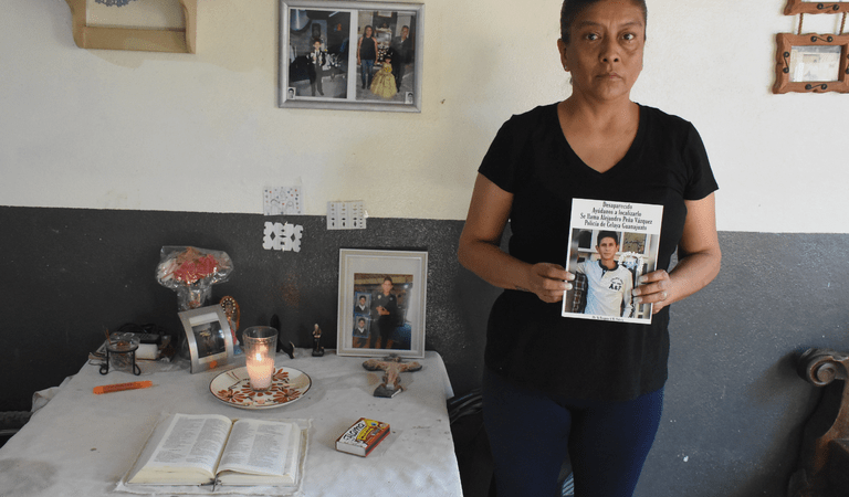 Dentro de las estadísticas, se encuentra la señora Vázquez Cruz, quien colocó un altar dedicado a Cristo crucificado y a la Virgen de Guadalupe, junto a ellos, hay fotos de su hijo desaparecido, una biblia, una veladora, flores rojas y el olor a incienso se encuentra impregnado en toda su casa.