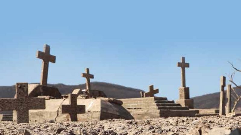 La sequía dejó al descubierto algunas casas, la escuela y el cementerio, por lo que algunos han aprovechado para visitar a sus familiares, quienes quedaron en aquellas viejas tumbas.