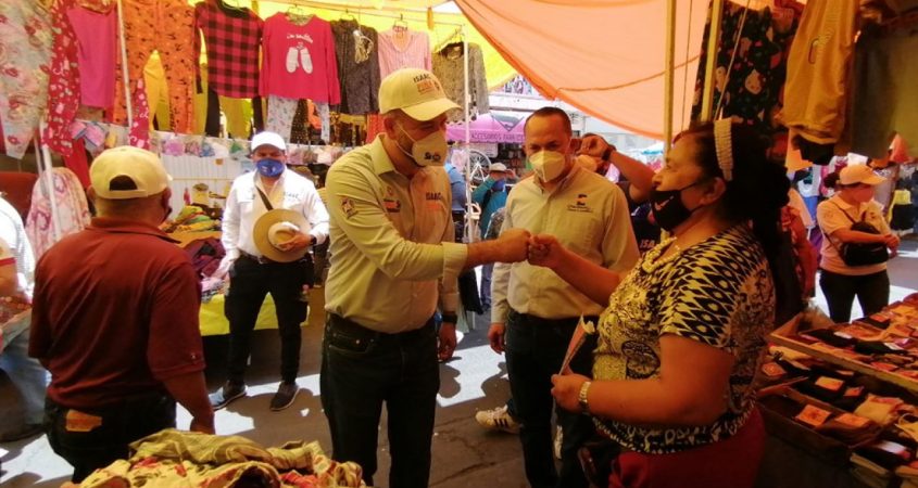 En el recorrido que realizó el candidato por el tianguis de los miércoles, estuvo acompañado por Juan José Gómez, representante de la unión de comerciantes San Antonio, quien le solicitó apoyo para tener lonas y estructuras, porque muchos comerciantes venden sus productos desde el piso, ya que no tienen recursos debido a la pandemia.