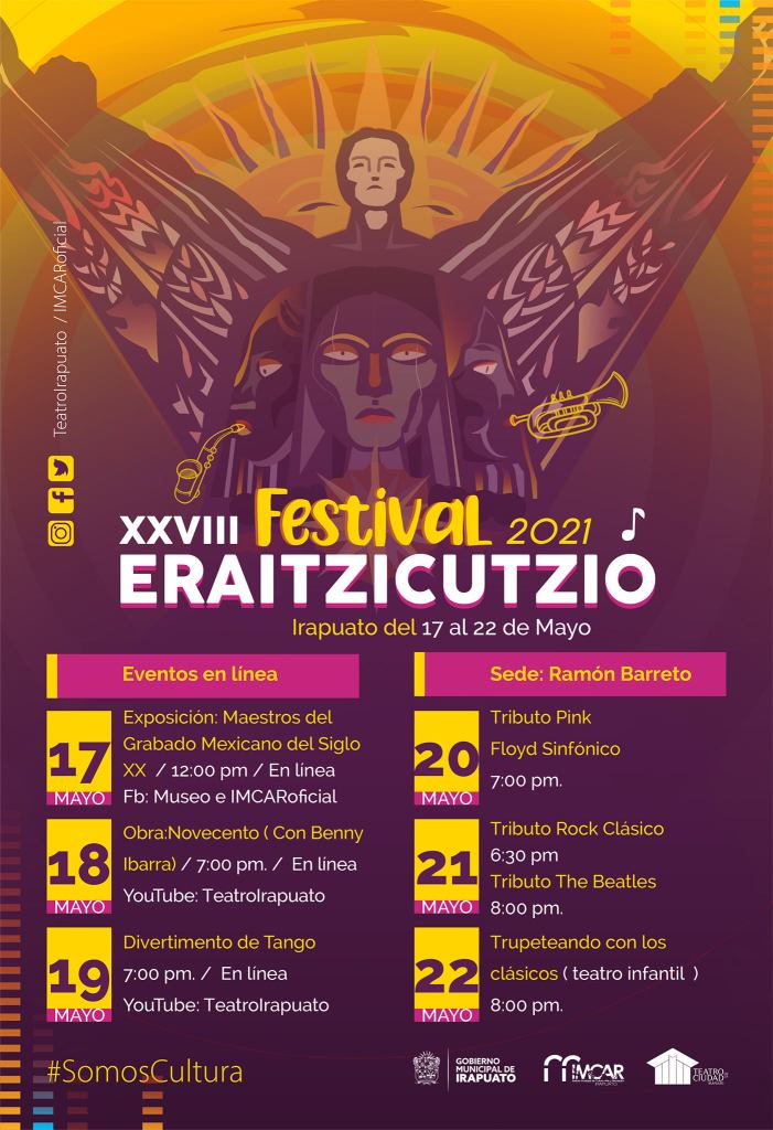 Del 17 al 22 de mayo, se llevará a cabo la XXVIII edición del Festival Eraitzicutzio, con eventos virtuales y presenciales para deleite de las y los irapuatenses.