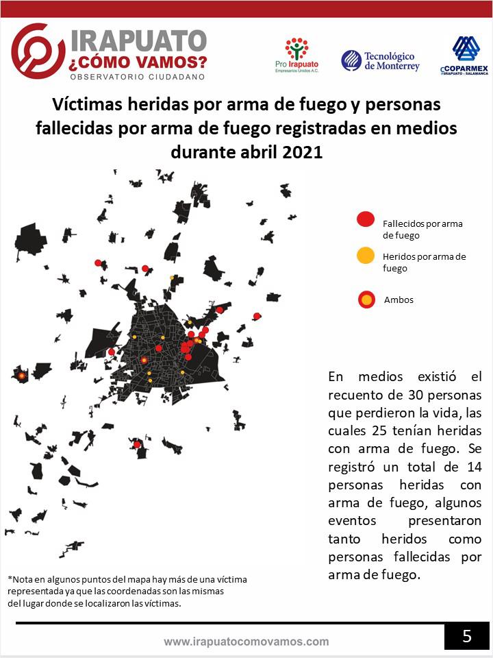 Durante este mes existió registro de un total de 83 registros en donde se relacionó el uso de armas de fuego. De estos registros, las víctimas por homicidio doloso fue una de las que mayor cantidad registraron siendo 25 víctimas, se registró 14 personas con lesiones producidas por arma de fuego, 13 registros relacionados con robos, 17 con la portación ilegal, disparos con arma de fuego y decomiso de armas de fuego, hubo recuento de 14 sucesos más donde estuvo presente arma de fuego.