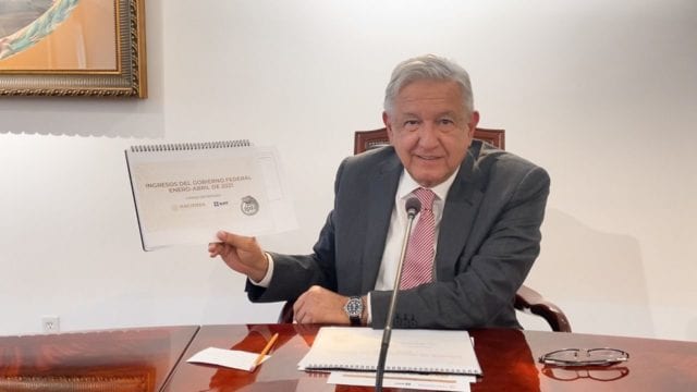 “Me están informando sobre los ingresos del gobierno federal de enero a abril de 2021 y vamos bien, estamos bien, muy de buenas, la gente nos está dando su confianza y les agradezco mucho porque están contribuyendo, no pagando impuestos.