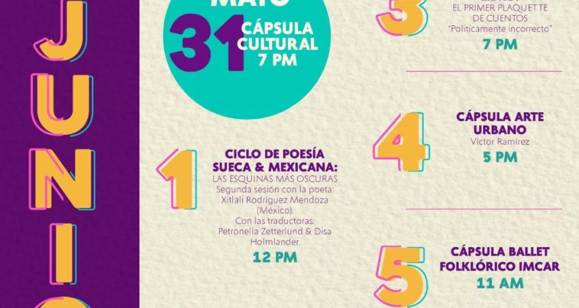 Para hoy, 31 de mayo, a las 7:00 de la tarde se contará con la presentación de una Cápsula Cultural; el martes 01 de junio, el mes inicia con el Ciclo de Poesía Sueca y Mexicana: ‘Las esquinas más oscuras’, con la poeta Xitlali Rodríguez Mendoza, a las 12:00 del mediodía.