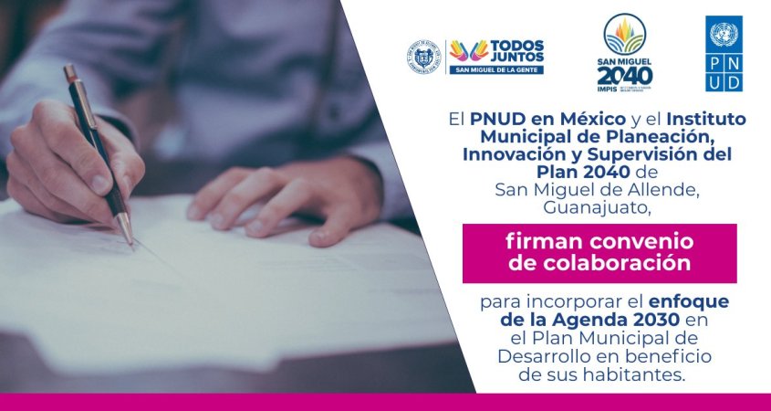 El Programa de las Naciones Unidas para el Desarrollo (PNUD) en México y el Instituto Municipal de Planeación, Innovación y Supervisión del Plan 2040 de San Miguel de Allende firmaron un convenio de colaboración para la implementación del proyecto denominado “Plan Municipal de Desarrollo 2040 de San Miguel de Allende, Guanajuato”.