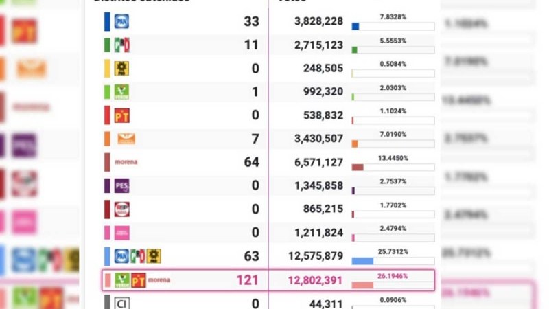 De acuerdo a esta actualización la coalición Juntos Haremos Historia obtuvo 121 distritos, seguida por el Movimiento de Regeneración Nacional (Morena) que se quedó con 64; en tercer lugar, la coalición Va por México, conformada por el PAN, PRI y PRD, consiguió 63 distritos; el Partido Acción Nacional (PAN) 33; el Partido Revolucionario Institucional (PRI) 11; Movimiento Ciudadano 7; y el Partido Verde Ecologista de México (PVEM) 1.