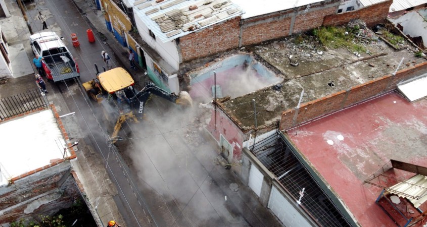Para evitar riesgo de colapso de una vivienda abandonada y en deterioro, la Coordinación de Protección Civil y Bomberos de Irapuato encabezó el trabajo de demolición de esta finca dañada.
