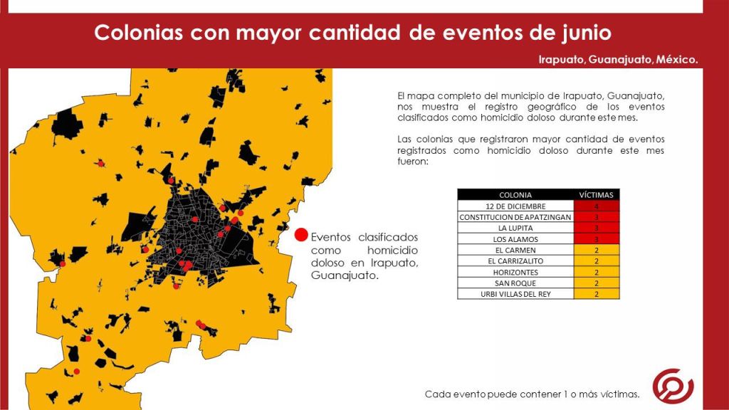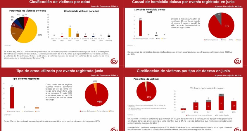 El reporte mensual de víctimas por homicidio doloso presenta la información condensada del registro de víctimas y eventos acontecidos en el municipio de Irapuato, Guanajuato.