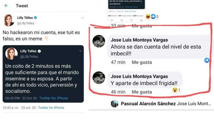 El 28 de octubre del 2020 a través de su cuenta de Facebook llamó “imbécil y frígida” a la senadora Lily Téllez tras la aparición de un tuit falso —un meme como si fuera un tuit de la senadora— donde se leía: “un coito de 2 minutos es más que suficiente para que el marido insemine a su esposa. A partir de ahí es todo vicio, perversión y socialismo”.