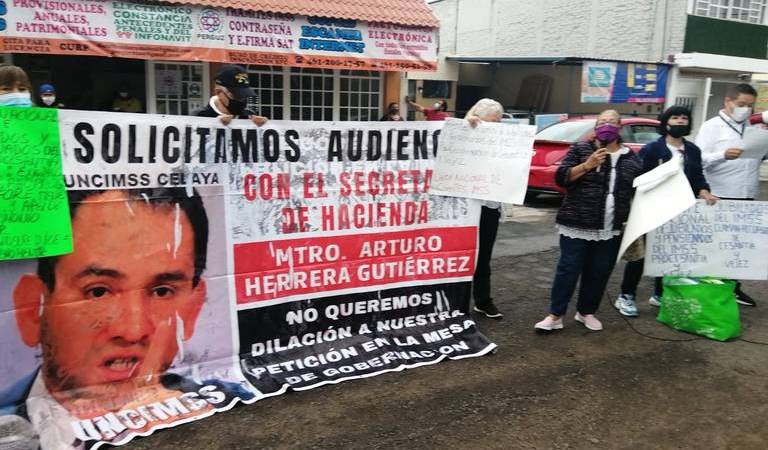 Más de una docena de jubilados y pensionados del Instituto Mexicano del Seguro Social se manifestaron fuera de las instalaciones de la Secretaria de Administración Tributaria en Celaya para exigir que se les regrese sus ahorros cesantía y vejez.