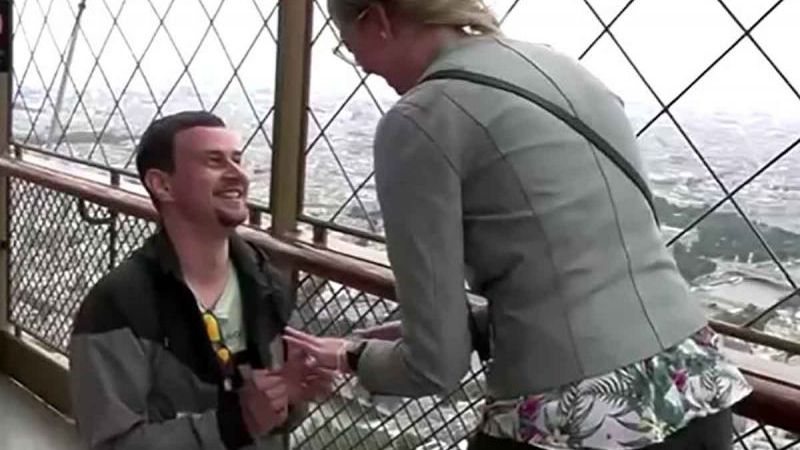 Con una vista panorámica de París como telón de fondo, Gopel, un alemán de 29 años, se arrodilló y colocó un anillo en el dedo de su novia, Katja Panke, de 25 años.