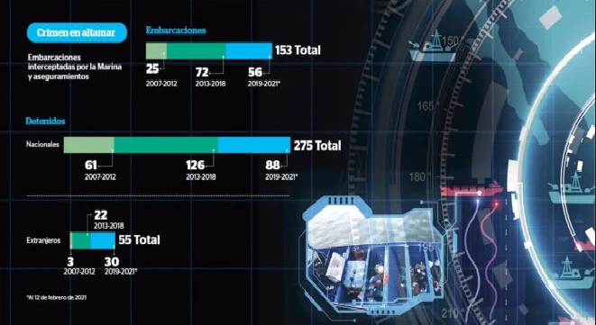 Con base en sus registros de la presente administración, la Secretaría asegura que en poco más de dos años (de 2019 al 2021) ha interceptado 56 de estos vehículos acuáticos del narcotráfico, con 12 mil 478.245 kg de mariguana, una cantidad mayor a la que se obtuvo en todo el sexenio pasado (12 mil 064.1 kg).