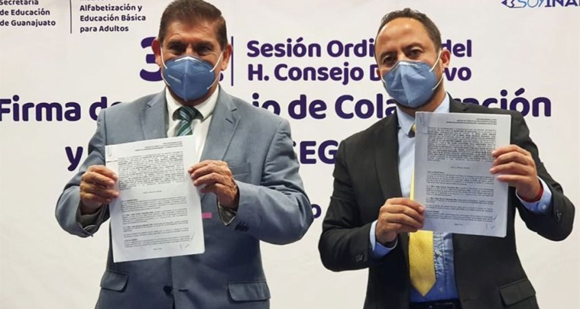 Con la finalidad de compartir información relevante que ayude a disminuir los índices de rezago educativo en el estado, en el marco de la Tercera Sesión Ordinaria 2021 del Consejo Directivo del INAEBA, el Instituto de Alfabetización y Educación Básica para Adultos y la Secretaría de Educación de Guanajuato (SEG) firmaron un convenio de colaboración y vinculación.
