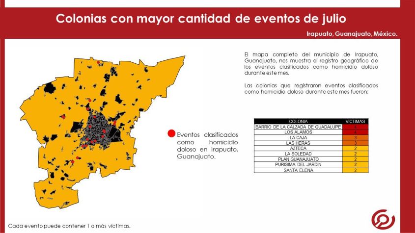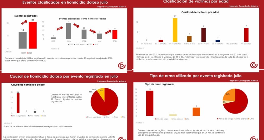 El reporte mensual de víctimas por homicidio doloso presenta la información condensada del registro de víctimas y eventos acontecidos en el municipio de Irapuato, Guanajuato.