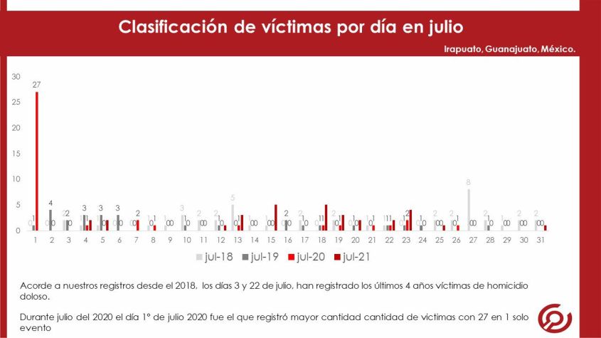 Durante julio 2021 acorde a nuestro registro de homicidio doloso existió recuento de 21 eventos donde una persona perdió la vida, por un total de 31 víctimas.