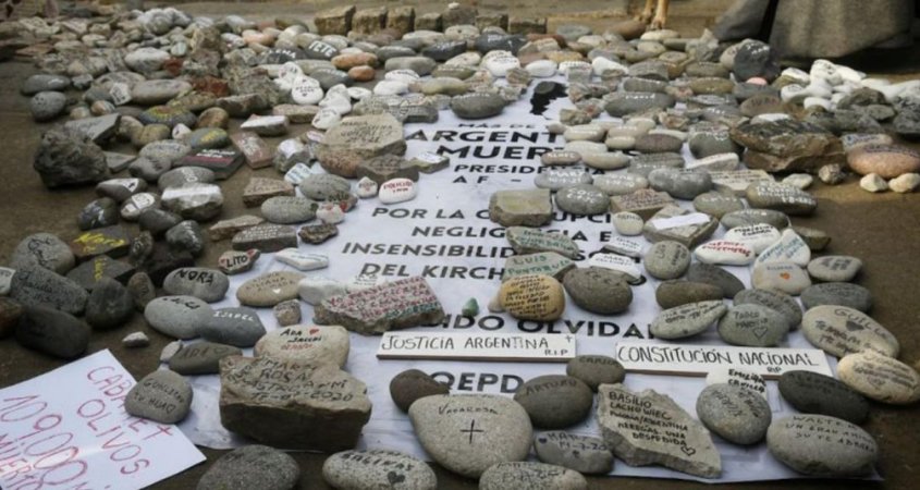 Decenas de piedras con el nombre de algunos de los casi 110 mil fallecidos por COVID-19 en Argentina fueron depositadas frente a la Casa de Gobierno y la residencia del presidente Alberto Fernández en repudio al manejo de la pandemia.
