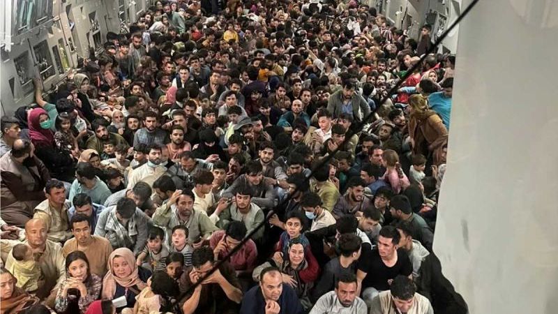 La foto muestra a más de 600 afganos -mujeres, hombres, niños y ancianos- apiñados en el interior de un enorme avión militar estadunidense, durante la dramática evacuación de personas horas después de que Kabul, la capital de Afganistán, cayera el domingo en manos de los talibanes.