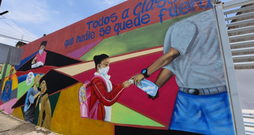 Mientras que el mural de la escuela Benito Juárez, ‘Todos a clases, que nadie se quede fuera’, es alusivo a los cuidados que se deben tomar en cuenta al regreso a clases, para que niños y niñas vuelvan a las aulas de manera segura y con un menor riesgo de contagio por Covid-19.