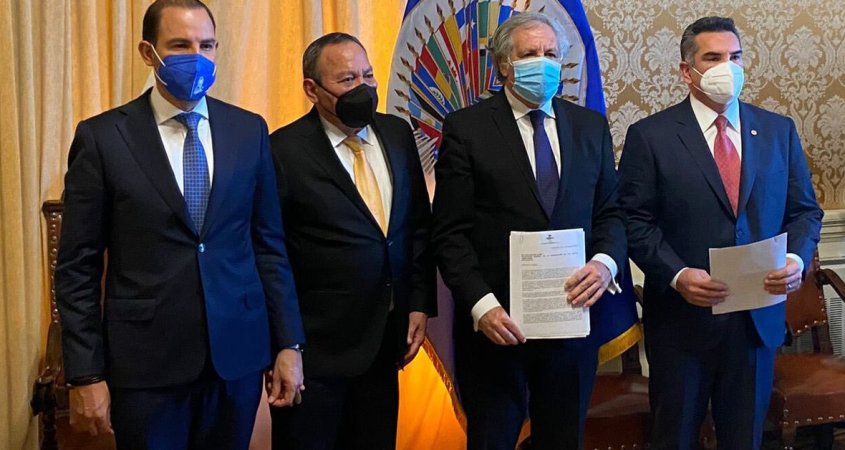 Los dirigentes del PRI (Partido Revolucionario Institucional), PAN (Partido Acción Nacional) y PRD (Partido de la Revolución Democrática), Alejandro Moreno, Marko Cortés y Jesús Zambrano, respectivamente, se reunieron este lunes con el secretario general de la Organización de Estados Americanos (OEA), Luis Almagro, para denunciar una supuesta intromisión del crimen organizado en las elecciones del 6 de junio pasado.