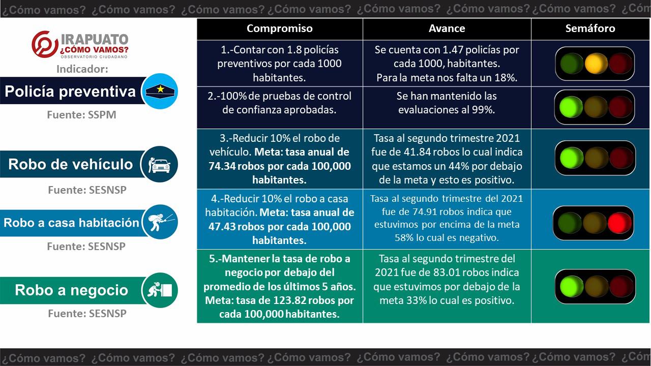 En el compromiso de contar con 1.8 policías por cada 1000 habitantes, al cierre del 2do trimestre 2021, nos falta un 18% para poder llegar al objetivo planteado y faltando poco menos de 50 días, teniendo todavía una generación más de cadetes en proceso de acreditación la cual se graduará en el mes de octubre ya con la nueva administración y considerando que los 46 elementos de esa academia se graduarán, alcanzaríamos 1.55 elementos lo cual no es suficiente y por ello este compromiso no se cumplirá, rescatamos que se haya avanzado mucho en este tema, la nueva administración contará con una Secretaria de Seguridad Ciudadana y con más policías que en administraciones anteriores, lo cual es un avance importante, estaremos una vez que finalice el mes de Septiembre para hacer el reporte del ultimo trimestre de esta administración para ver como quedaron los compromisos.