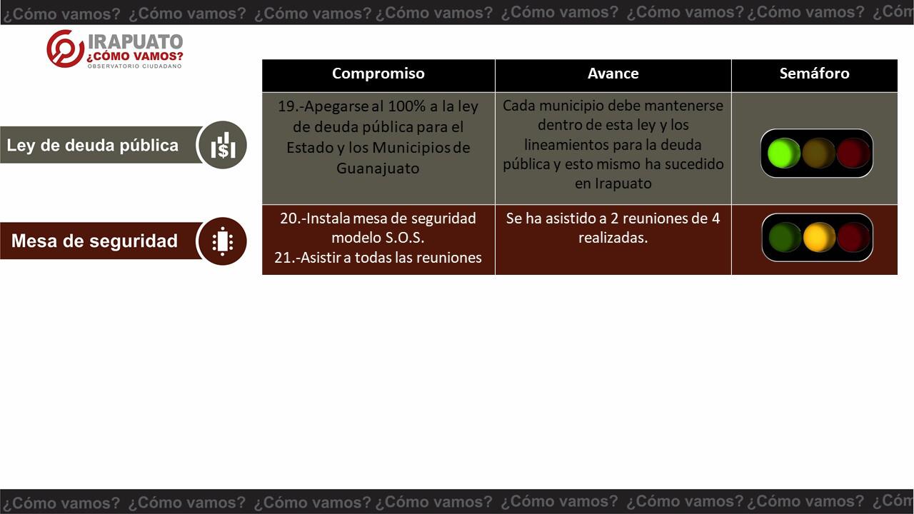 En cuanto a la deuda pública del municipio, cada municipio debe mantenerse dentro de esta ley y los lineamientos para la deuda pública y esto mismo ha sucedido en Irapuato, por lo cual tiene altas probabilidades de ser un compromiso cumplido.