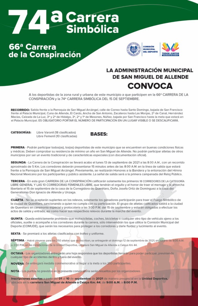 Previo a la competencia, los corredores acudirán a las mesas de registro para confirmar su participación, pasar por los filtros sanitarios y recibir su número oficial personalizado. La recomendación general es acudir sin acompañantes para evitar aglomeración de personas, por lo que se invita a la ciudadanía en general seguir la competencia a través de las redes sociales del Gobierno Municipal de San Miguel de Allende.