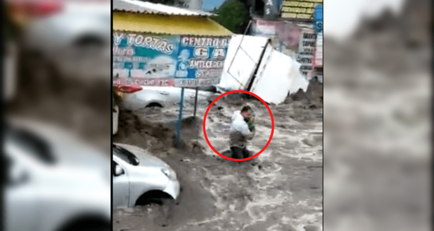 A través de redes sociales se ha compartido un video del momento en que varias personas se unen para rescatar un bebe de un puesto que era arrastrado por la corriente de agua en el municipio de Ecatepec, Estado de México.