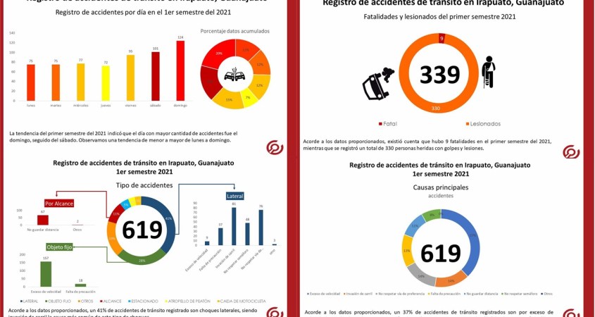 Durante el primer semestre del 2021 acorde a los datos requeridos por medio de la plataforma de transparencia a la dirección de tránsito y movilidad del municipio de Irapuato se tuvo registro de un total de 619 accidentes de tránsito lo cual indicó que cada 6 horas y 58 minutos aproximadamente se registra un accidente automovilístico en nuestra ciudad.