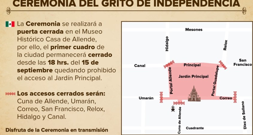 En atención a la contingencia sanitaria y con la finalidad de preservar las tradiciones del Mes Patrio, la ceremonia del Grito de Independencia se realizará a puerta cerrada; desde las 06:00 P.M. del 15 de septiembre quedará restringido el acceso al primer cuadro de la ciudad.