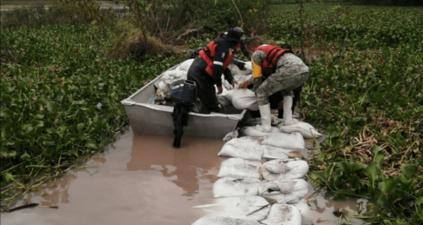Para llevar a cabo estas labores, personal de auxilio realizó el cierre de la fractura en el dren utilizando seis mil costales, así como 50 costales de una tonelada, para crear un refuerzo y evitar que el agua siga corriendo.