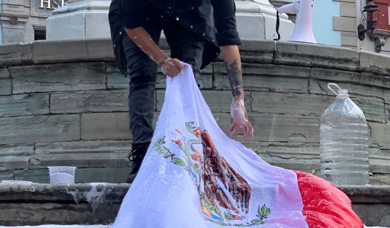 Al mediodía de este jueves, en el marco de la celebración de la independencia, un grupo de artistas de manera simbólica limpiaron la sangre de una bandera nacional con agua y jabón, mientras mencionaban los nombres de algunas víctimas de desaparición forzada.