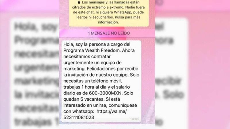 Uno de estos casos es el de Magaly Fuentes, quién al contestar un mensaje de WhatsApp para una oferta de trabajo, ahora la están extorsionando con 100 mil pesos, dinero que no tiene, pero tiene la opción de vender droga para los extorsionadores.