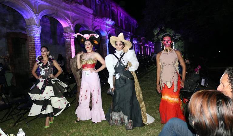La espectacular pasarela de catrinas con diseños totalmente originales por estudiantes de la Universidad CAM (Colegio de Arte y Moda) se llevó a cabo en la ex hacienda San Isidro bajo las medidas que indica la secretaria de salud.