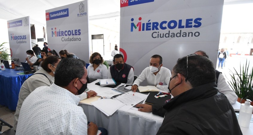 El patio de la Presidencia Municipal, en el Centro Histórico, es la sede del programa, que reúne a personal de más de 16 dependencias generales y organismos descentralizados de la Administración Pública 2021-2024, para conocer, atender y dar solución a problemáticas e inquietudes de las y los irapuatenses.