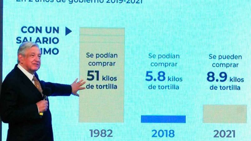 López Obrador detalló que cuando en el 2018 asumió la presidencia de la república, el salario de los trabajadores alcanzaba para 5.7 kilos de tortilla y en la actualidad, que se ha aumentado casi 50 por ciento, alcanza para 7.8 kilos de tortilla.