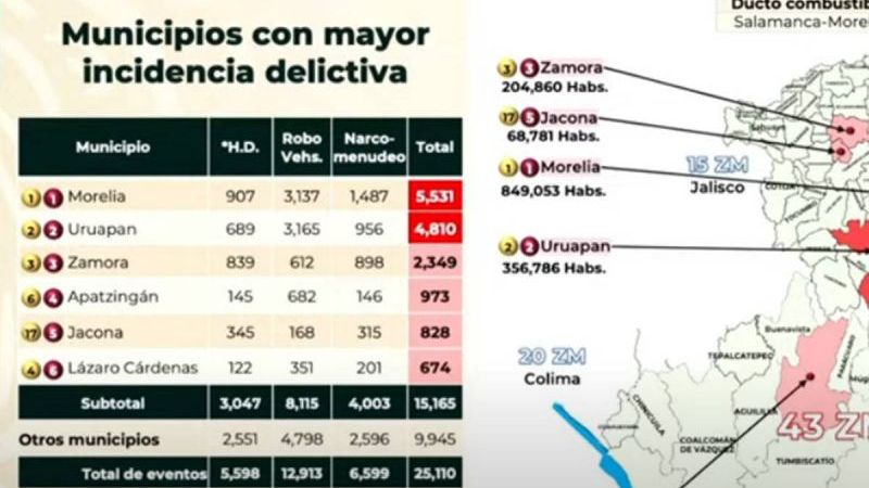 En Morelia, Uruapan y Zamora son las localidades donde se concentra el mayor número de homicidios dolosos, estos suman el 43.5% de los casos.