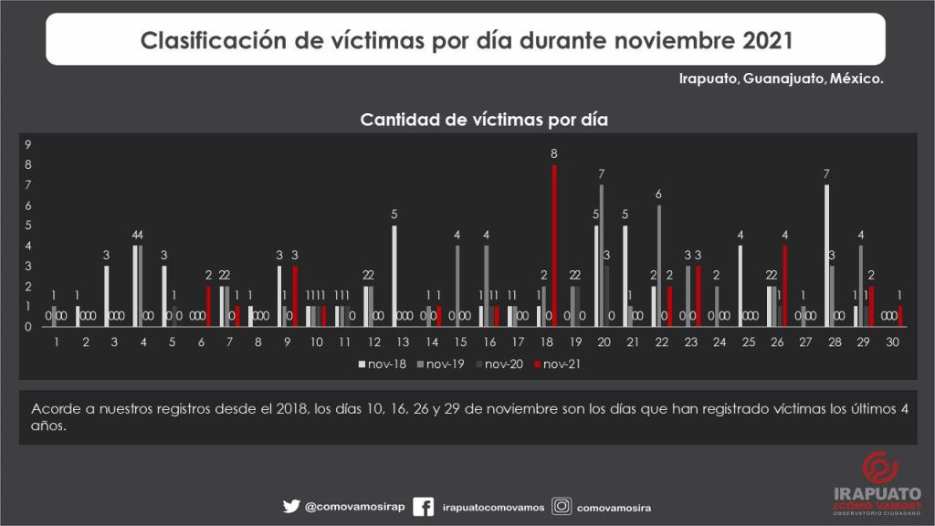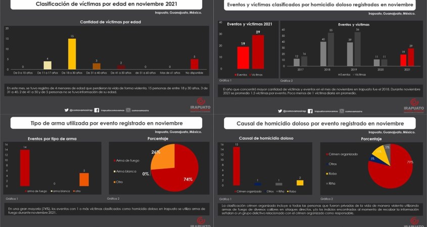 Durante noviembre 2021 acorde a nuestro registro de homicidio doloso existió recuento de 19 eventos donde al menos una persona perdió la vida, por un total de 29 víctimas.