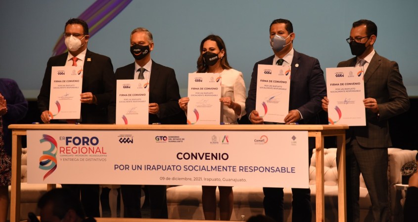 El gobernador Diego Sinhue Rodríguez Vallejo, acompañado de autoridades municipales, Ricardo Bucio Mújica, presidente ejecutivo de Cemefi y del Consejo Coordinador Empresarial de Irapuato, entregaron reconocimientos como Empresas Socialmente Responsables (ESR) a MiPyMes y grandes empresas de Michoacán, Aguascalientes y Guanajuato.