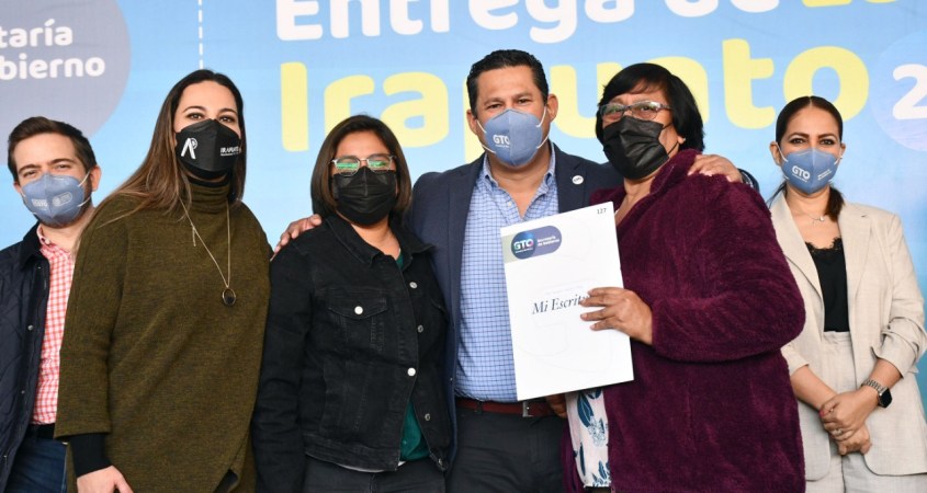 Este día 136 familias irapuatenses recibieron de manos del gobernador Diego Sinhue Rodríguez Vallejo, la presidenta municipal Lorena Alfaro García y la secretaria de gobierno Libia Denisse García Muñoz Ledo, la documentación que los acreditan como propietarios de su vivienda.