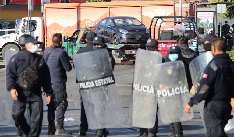 En este punto, alrededor de las 9:39 horas, elementos de Seguridad Pública arribaron con grúas para retirar los vehículos que cortaban la circulación, lo que desencadenó un enfrentamiento entre los elementos policiacos y los conductores.